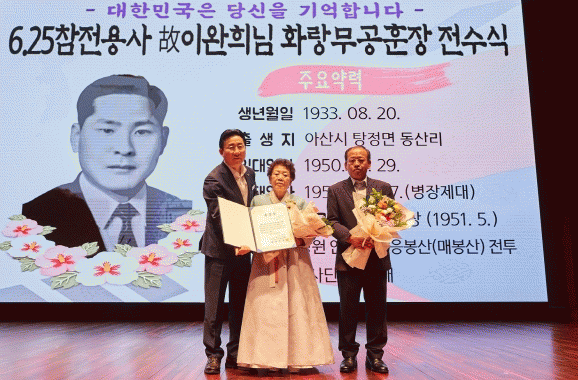 [HKSÇàÁ¤¹æ¼Û]¾Æ»ê½Ã´Â Áö³ 2ÀÏ ½Ãû ½Ã¹ÎȦ¿¡¼ ¿¸° ¿ù·Ê¸ðÀÓ¿¡¼ 6¡¤25 ÂüÀü À¯°øÀÚ °í(ͺ) ÀÌ¿ÏÈñ º´ÀåÀÇ ¹è¿ìÀÚ ¼¿ëÈ, ¾Æµé ÀÌ¿ëµæ ¾¾¿¡°Ô ȶû¹«°øÈÆÀå°ú Áõ¼, ±â³äÆÐ¸¦ Àü´ÞÇß´Ù.