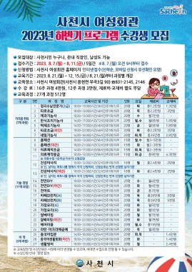 [¿µ³²±Ç] »çõ½Ã ¿©¼ºÈ¸°ü, 2023³â ÇϹݱâ ÇÁ·Î±×·¥ ¼ö°»ý ¼±Âø¼ø ¸ðÁý |2023. 07.31