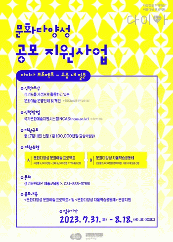 [¼öµµ±Ç] °æ±â¹®ÈÀç´Ü, 2023 ¹®È´Ù¾ç¼º °ø¸ðÁö¿ø»ç¾÷ ¡¶´ÙÀ̾ÆÇÁ·ÎÁ§Æ® : ¿äÁò ³» Áú¹®¡· Á¢¼ö ÁøÇà |2023. 07.31