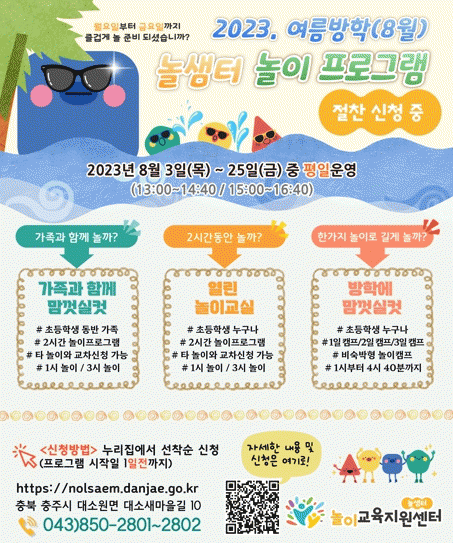 [ÃæÃ»±Ç] ÃæºÏ±³À°Ã» ³îÀ̱³À°Áö¿ø¼¾ÅÍ, ¿©¸§¹æÇÐ ³îÀÌ ÇÁ·Î±×·¥ ¿î¿µ |2023. 07.30