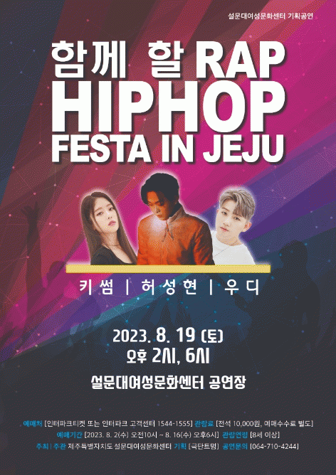[HKSÇàÁ¤¹æ¼Û]Á¦ÁÖÆ¯º°ÀÚÄ¡µµ ¼³¹®´ë¿©¼º¹®È¼¾ÅÍ´Â 8¿ù 19ÀÏ ¿ÀÈÄ 2½Ã¿Í 6½Ã 2ȸ¿¡ °ÉÃÄ Ã»¼Ò³âÀ» À§ÇÑ ±âȹ°ø¿¬ ¡®ÇÔ²²ÇÒ ·¦-ÈüÇÕ Æä½ºÅ¸ ÀÎ(Rap-hiphop festa in) Á¦ÁÖ¡¯¸¦ ¿¬´Ù.