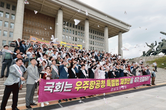 [HKSÇàÁ¤¹æ¼Û]Çѱ¹Çü ³ª»çÀÎ ¿ìÁÖÇ×°øÃ»ÀÇ ¼³¸³À» À§ÇÑ Æ¯º°¹ýÀÌ ±¹È¸°úÇбâ¼úÁ¤º¸¹æ¼ÛÅë½ÅÀ§¿øÈ¸ÀÇ °ÅµìµÈ ÆÄÇàÀ¸·Î ÁøÅëÀ» °ÞÀÚ ¡®»Ô³¡¯ °æ³²µµ¹ÎµéÀÌ Çൿ¿¡ ³ª¼¹´Ù.