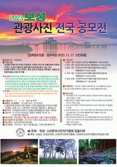 [HKSÇàÁ¤¹æ¼Û]º¸¼º±ºÀÇ ¾Æ¸§´Ù¿î °æ°üÀ» ã´Â ¡®2023 º¸¼º °ü±¤ »çÁø Àü±¹ °ø¸ðÀü¡¯ÀÌ °³ÃֵȴÙ. À̹ø °ü±¤ »çÁø °ø¸ðÀüÀº (»ç)Çѱ¹»çÁøÀÛ°¡Çùȸ ÀåÈïÁöºÎ¿¡¼ ÁÖ°üÇÏ¸ç º¸¼º±º, º¸¼º±ºÀÇȸ, (»ç)Çѱ¹»çÁøÀÛ°¡Çùȸ, (»ç)Çѱ¹»çÁøÀÛ°¡Çù¡¦