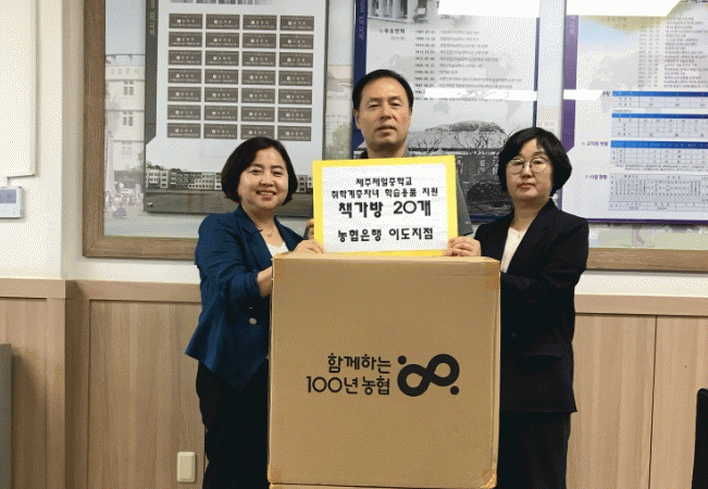 [HKSÇàÁ¤¹æ¼Û]Á¦ÁÖµµ±³À°Ã» Á¦ÁÖÁ¦ÀÏÁßÇб³´Â 24ÀÏ, ³óÇùÀºÇà À̵µÁöÁ¡À¸·ÎºÎÅÍ 'Ãë¾à°èÃþÀÚ³à ÇнÀ¿ëǰ Áö¿ø'À¸·Î Ã¥°¡¹æ 20°³¸¦ ±âÁõ¹Þ¾Ò´Ù. ³óÇùÀç´Ü¿¡¼´Â Ãë¾à°èÃþ ÀÚ³à ¹× ³ó¾÷ÀÎ °¡Á¤ÀÇ °æÁ¦Àû ºÎ´ãÀ» °æ°¨ÇÏ°í ±³À°¿©°Ç Çâ»óÀ»¡¦