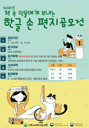 [HKSÇàÁ¤¹æ¼Û]»çõ½Ã¾î¸°À̵µ¼°üÀº 7¿ù 20ÀϺÎÅÍ 8¿ù 9ÀϱîÁö ¡®Ã¥ ¼Ó Àι°¿¡°Ô º¸³»´Â ÇÑ±Û ¼Õ ÆíÁö¡¯ °ø¸ðÀüÀ» °³ÃÖÇÑ´Ù°í 21ÀÏ ¹àÇû´Ù. À̹ø °ø¸ðÀüÀº µðÁöÅРȯ°æ¿¡ Àͼ÷ÇÑ ¾ÆÀ̵éÀÌ Ã¥ ÀбâÀÇ Áñ°Å¿ò°ú ÇÑ±Û ¼Õ±Û¾¾ÀÇ ¾Æ¸§´Ù¿òÀ» ¡¦
