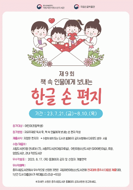 [ÃæÃ»±Ç] ÃæÁֽø³µµ¼°ü, 'Ã¥ ¼Ó Àι°¿¡°Ô º¸³»´Â ÇÑ±Û ¼ÕÆíÁö' °ø¸ðÀÛ ¸ðÁý |2023. 07.20