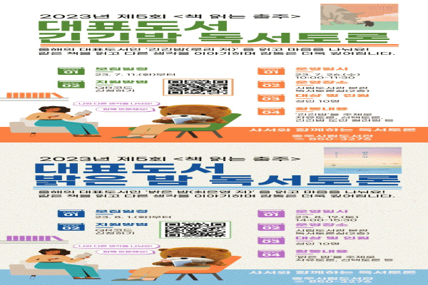 [HKSÇàÁ¤¹æ¼Û]ÃæÁֽø³µµ¼°üÀº 2023³â Á¦5ȸ 'Ã¥ ÀÐ´Â ÃæÁÖ' µ¶¼¿îµ¿ÀÇ ÀÏȯÀ¸·Î ´ëÇ¥µµ¼ µ¶¼Åä·ÐÀ» 7¿ù°ú 8¿ù ÃÑ 2ȸ ¿î¿µÇÑ´Ù. ½Ã´Â µ¶¼Åä·Ð ÁÖÁ¦µµ¼·Î ¡®±ä±ä¹ã¡¯°ú ¡®¹àÀº ¹ã¡¯À» ¼±Á¤Çß´Ù°í ¹àÇû´Ù. µ¶¼Åä·Ð Á¦1źÀÇ ÁÖÁ¦ ¡¦