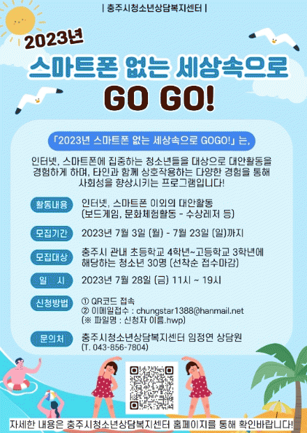 [HKSÇàÁ¤¹æ¼Û]ÃæÁÖ½Ãû¼Ò³â»ó´ãº¹Áö¼¾ÅÍ´Â ¿©¸§¹æÇÐÀ» ¸Â¾Æ ¡®2023³â ½º¸¶Æ®Æù ¾ø´Â ¼¼»ó ¼ÓÀ¸·Î GOGO!¡¯ ÇÁ·Î±×·¥ Âü°¡ÀÚ¸¦ ¿À´Â 23ÀϱîÁö ¸ðÁý ÁßÀÌ´Ù.