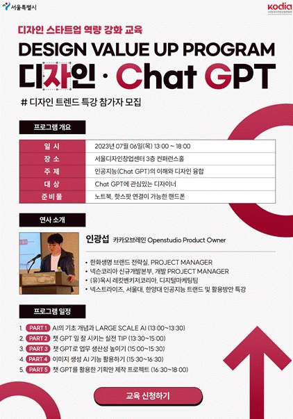 [HKSÇàÁ¤¹æ¼Û]¼¿ï½Ã´Â ÀΰøÁö´É(Chat GPT), ȯ°æ¡¤»çȸ¡¤Åõ¸í °æ¿µ(ESG), µðÀÚÀÎ Çõ½Å»ç·Ê µî µðÀÚÀÎ Æ®·»µå ±³À°°ú ´ë»óº° ¼ö¿äÁ¶»ç¸¦ ¹Ý¿µÇÑ µðÀÚÀÎ »ê¾÷°è ´ë»óº° ¸ÂÃãÇü ±³À°À» 7¿ùºÎÅÍ ¿î¿µÇÑ´Ù.