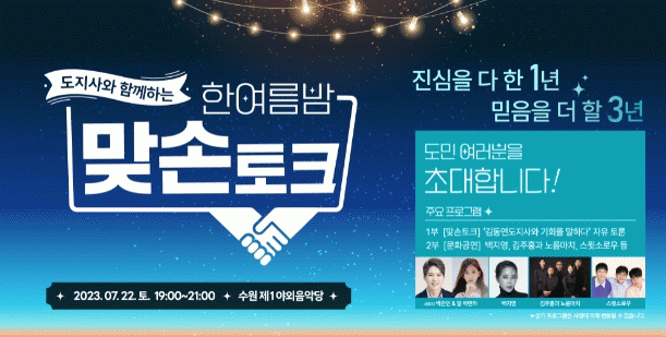[¼öµµ±Ç] °æ±âµµ ±èµ¿¿¬, 7¿ù 22ÀÏ ¼ö¿ø¿¡¼ µµ¹Î ¸Â¼ÕÅäÅ©. Âü°¡ÀÚ 1õ400¸í ¸ðÁý |2023. 06.26