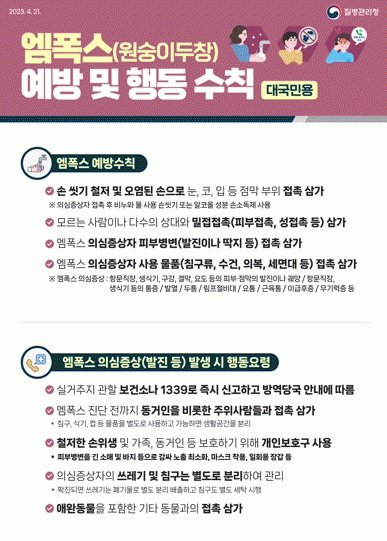 [HKSÇàÁ¤¹æ¼Û]ÀӽDZºÀÌ ÃÖ±Ù ±¹³» °¨¿°À¸·Î ÃßÁ¤µÇ´Â ¿¥Æø½º(MPOX) È®ÁøÀÚ°¡ Áõ°¡ÇÔ¿¡ µû¶ó ¿¥Æø½º ¿¹¹æÀ» À§ÇÑ Çൿ ¼öÄ¢À» ¾È³»ÇÏ°í ³ª¼¹´Ù.