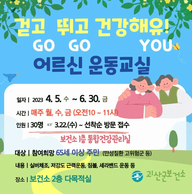 [HKSÇàÁ¤¹æ¼Û]ÃæºÏ ±«»ê±ºÀº 65¼¼ÀÌ»ó ÁÖ¹ÎÀÇ °Ç°ÁõÁøÀ» À§ÇÑ ¡®°È°í(GO) ¶Ù°í(GO) °Ç°ÇØÀ¯(YOU)¡¯¡± ¿îµ¿±³½Ç Âü¿©ÀÚ¸¦ ¸ðÁýÇÑ´Ù°í ¹àÇû´Ù.