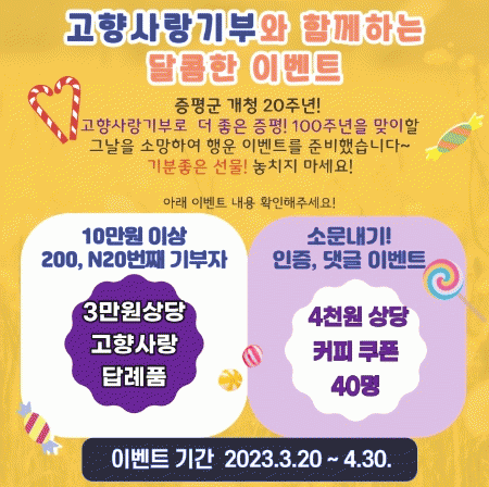 À̺¥Æ® ±â°£ Áß ÁõÆò±º¿¡ °íÇâ»ç¶û±âºÎ±ÝÀ» 10¸¸ ¿ø ÀÌ»ó ±âºÎÇÑ »ç¶÷À» ´ë»óÀ¸·Î ±âºÎ ¼ø¹ø¿¡ µû¶ó 200¹øÂ°, n20¹øÂ°(220¹øÂ°, 320¹øÂ°) ±âºÎÀÚ¡¦ |
