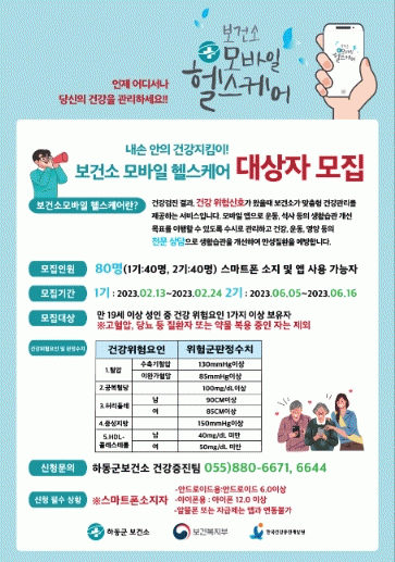 [HKSÇàÁ¤¹æ¼Û]Çϵ¿±ºÀº Áö¿ªÁÖ¹ÎÀÇ ÀÚ°¡ °Ç°°ü¸®´É·ÂÀ» ³ôÀ̰íÀÚ ¸ð¹ÙÀÏ ¾ÛÀ» Ȱ¿ëÇÑ 2023³â ¸ÂÃãÇü ¸ð¹ÙÀÏ ÇコÄɾî»ç¾÷À» ÃßÁøÅ°·Î Çϰí, ¿À´Â 24ÀϱîÁö 1±â 40¸í, 6¿ù 5ÀÏ¡16ÀÏ 2±â 40¸í µî 80¸íÀ» ¼±Âø¼ø ¸ðÁýÇÑ´Ù°í 15ÀÏ ¹àÇû´Ù.