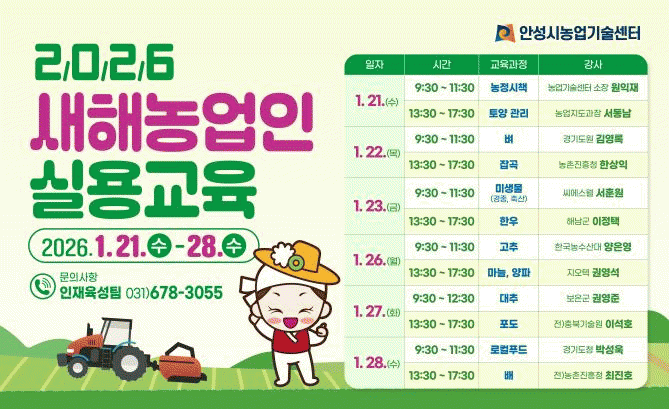 [HKSÇàÁ¤¹æ¼Û]¾È¼º½Ã´Â 2026³â »õÇØ³ó¾÷ÀÎ ½Ç¿ë±³À°À» 1¿ù 21ÀϺÎÅÍ 28ÀϱîÁö 6Àϰ£ ÃÑ 12°ú¸ñÀ» ¿î¿µÇÑ´Ù°í ¹àÇû´Ù. À̹ø »õÇØ³ó¾÷ÀÎ ½Ç¿ë±³À°Àº 2026³â ³ó¾÷±â¼ú¼¾ÅÍ Àü¹ÝÀûÀÎ »ç¾÷À» ¿øÀÍÀç ¼ÒÀåÀÌ Á÷Á¢ °ÀÇÇÏ´Â ³óÁ¤½ÃÃ¥°ÀǸ¦ ½ÃÀÛ¡¦