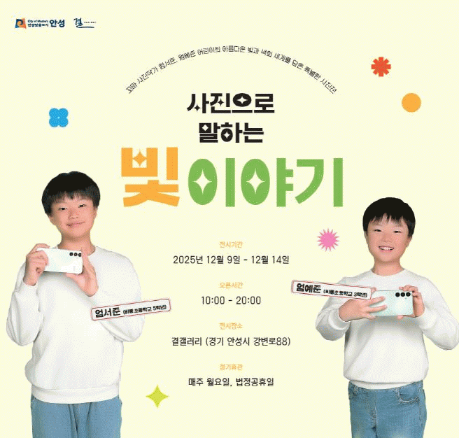 [HKSÇàÁ¤¹æ¼Û]¾È¼ºÃµ ¿ì¸®µ¿³× ÀÛÀº¹Ì¼ú°ü °á°¶·¯¸®´Â 12¿ù 9ÀϺÎÅÍ 12¿ù 14ÀϱîÁö µÎ ¾î¸°ÀÌ »çÁøÀÛ°¡ ¾ö¼ÁØ, ¾ö¿¹ÁØÀÇ Æ¯º°ÇÑ Àü½Ã ¡®»çÁøÀ¸·Î ¸»ÇÏ´Â ºû À̾߱⡯¸¦ °³ÃÖÇÑ´Ù. À̹ø Àü½Ã´Â µÎ ÇüÁ¦°¡ ÀÏ»óÀÇ Àå³°¨°ú ½º¸¶Æ®ÆùÀ» Ȱ¡¦