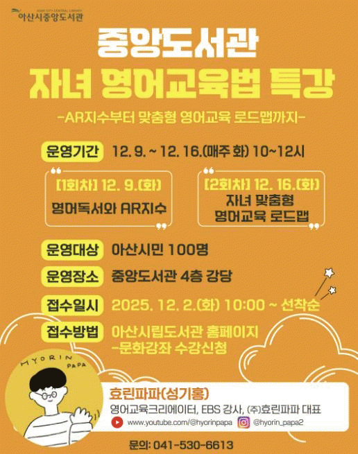 [HKSÇàÁ¤¹æ¼Û]¾Æ»ê½Ã Áß¾Óµµ¼°üÀº ¿À´Â 12¿ù 9Àϰú 16ÀÏ, µÎ Â÷·Ê¿¡ °ÉÃÄ ¿µ¾î±³À° Àü¹®°¡ È¿¸°ÆÄÆÄ(¼º±âÈ«)¿Í ÇÔ²²ÇÏ´Â ÀÚ³à ¿µ¾î±³À°¹ý Ư°À» ¿î¿µÇÑ´Ù. À̹ø Ư°Àº ÀÚ³à ¿µ¾î±³À°ÀÇ ÇÙ½ÉÀ» ÀÌÇØÇϰí, º¯ÈÇÏ´Â ±³À°È¯°æ¿¡ Àû¿ëÇÒ ¡¦