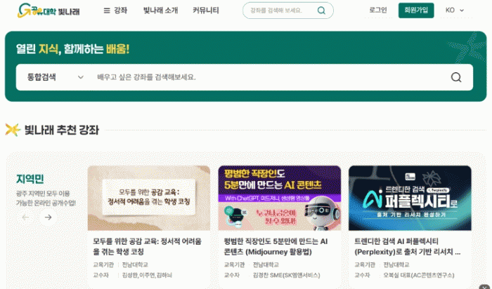 [HKSÇàÁ¤¹æ¼Û]Àü³²´ëÇб³ RISE»ç¾÷´Ü(´ÜÀå ÀÌÀ±¼º)Àº Áö³ 11¿ù 24ÀÏ, G-RISE °øÀ¯´ëÇÐ Ç÷§Æû ¡®ºû³ª·¡¡¯¸¦' °ø½Ä °ø°³Çß´Ù°í ¹àÇû´Ù. ¡®ºû³ª·¡¡¯´Â ¡®ºû°íÀ» ¹è¿ò³ª·¡¡¯ÀÇ ÁÙÀÓ¸»·Î, ±¤ÁÖ ½Ã¹ÎÀ̶ó¸é ´©±¸³ª ¿Â¶óÀÎ °Á¸¦ ¹«·á·Î ¼ö¡¦