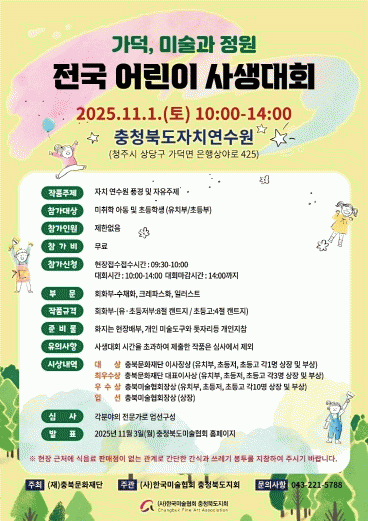 |  [ÃæÃ»±Ç] ÃæºÏµµ °¡´ö, ¹Ì¼ú°ú Á¤¿ø ¡®Àü±¹ ¾î¸°ÀÌ »ç»ý´ëȸ¡¯ °³ÃÖ  |2025. 10.31 [HKSÇàÁ¤¹æ¼Û]  ÃæºÏµµ´Â ¿À´Â 11¿ù 1ÀÏ ¿ÀÀü 10½Ã, ÃæÃ»ºÏµµÀÚÄ¡¿¬¼ö¿ø(ûÁֽà »ó´ç±¸ °¡´ö¸é ÀºÇà»ó¾ß·Î 425) ÀÏ¿ø¿¡¼ ¡®°¡´ö ¹Ì¼ú°ú Á¤¿ø, Àü±¹ ¾î¸°ÀÌ »ç»ý´ëȸ¡¯¸¦ °³ÃÖÇÑ´Ù°í ¹àÇû´Ù.