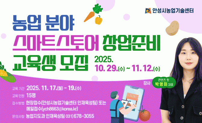 |  [¼öµµ±Ç] ¾È¼º½Ã³ó¾÷±â¼ú¼¾ÅÍ, ³ó¾÷ºÐ¾ß ½º¸¶Æ®½ºÅä¾î â¾÷Áغñ ±³À°»ý ¸ðÁý!  |2025. 10.30 [HKSÇàÁ¤¹æ¼Û]¾È¼º½Ã³ó¾÷±â¼ú¼¾ÅÍ´Â ³ó¾÷ÀÎÀÇ ¿Â¶óÀÎ ÆÇ·Î È®´ë¿Í µðÁöÅÐ °æ¿µ ¿ª·® °È¸¦ À§ÇÑ ¡®³ó¾÷ºÐ¾ß ½º¸¶Æ®½ºÅä¾î â¾÷Áغñ¡¯ ±³À°»ýÀ» ¿À´Â 11¿ù 12ÀϱîÁö ¸ðÁýÇÑ´Ù°í ¹àÇû´Ù.