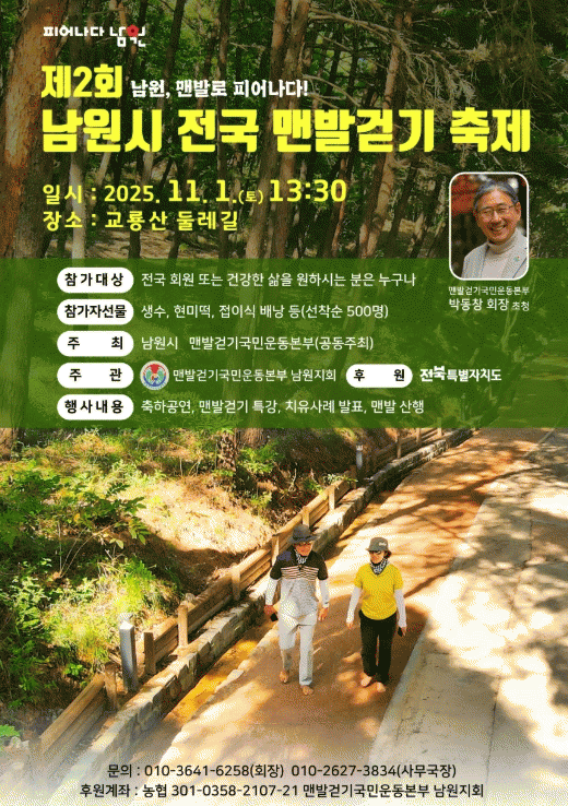 |  [È£³²±Ç] Á¦2ȸ ³²¿ø½Ã ¸Ç¹ß°È±â Çà»ç °³ÃÖ   |2025. 10.30 [HKSÇàÁ¤¹æ¼Û]Á¦2ȸ ³²¿ø½Ã Àü±¹ ¸Ç¹ß°È±â ÃàÁ¦, 11¿ù 1ÀÏ ±³·æ»ê µÑ·¹±æ¿¡¼ °³ÃÖ