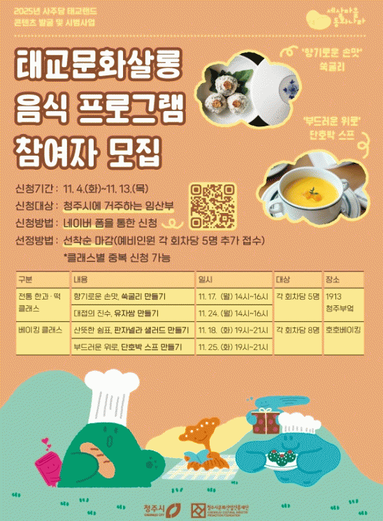 [HKSÇàÁ¤¹æ¼Û]Á¤¼ºÀÇ ¼Õ¸ÀÀ¸·Î ¹î ¼Ó ¾ÆÀÌ¿Í ±³°¨Çϴ Ưº°ÇÑ ½Ã°£ÀÌ ¿¸°´Ù. ûÁÖ½Ã¿Í Ã»Áֽù®È»ê¾÷ÁøÈïÀç´ÜÀº ¿À´Â 4~13ÀÏ Ã»ÁÖ¹®ÈÀç´Ü ´©¸®Áý¿¡¼ ¡®Å±³¹®È»ì·Õ À½½ÄÇÁ·Î±×·¥¡¯ Âü¿©ÀÚ¸¦ ¸ðÁýÇÑ´Ù. À̹ø ÇÁ·Î±×·¥Àº ûÁÖ Ãâ½Å¡¦