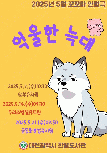 5¿ù 7ÀÏ, 14ÀÏ, 21ÀÏ ¿ÀÀü 10½Ã¿¡´Â »ïºÎÀ¯Ä¡¿ø, µÎ¸®ÃʵîÇб³º´¼³À¯Ä¡¿ø, ±Ýµ¿ÃʵîÇб³º´¼³À¯Ä¡¿ø¿¡¼ ¾Æ±âµÅÁö »ïÇüÁ¦¸¦ ÀçÇØ¼®ÇÑ À̾߱â '¾ï¿ïÇÑ ´Á´ë'¸¦ °ø¿¬ÇÒ ¿¹Á¤ÀÌ´Ù.