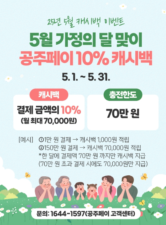 ÀÌ¿¡ µû¶ó ÃæÀüÀÏ¿¡ °ü°è ¾øÀÌ 5¿ù ÇÑ ´Þ µ¿¾È °øÁÖÆäÀÌ·Î °áÁ¦ÇÑ ±Ý¾× Áß 70¸¸¿ø±îÁö 10% ij½Ã¹éÀÌ Àû¿ëµÇ¸ç, ÃÖ´ë 7¸¸¿øÀÇ ÇýÅÃÀ» ¹ÞÀ» ¼ö ÀÖ´Ù.
