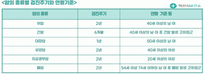 °ËÁø Ç׸ñÀº ¡âÀ§¾Ï(40¼¼ ÀÌ»ó, 2³â ÁÖ±â) ¡â°£¾Ï(40¼¼ ÀÌ»ó °íÀ§Ç豺, 6°³¿ù ÁÖ±â) ¡â´ëÀå¾Ï(50¼¼ ÀÌ»ó, 1³â ÁÖ±â) ¡âÀ¯¹æ¾Ï(40¼¼ ÀÌ»ó ¿©¼º, 2³â ÁÖ±â) ¡âÀڱðæºÎ¾Ï(20¼¼ ÀÌ»ó ¿©¼º, 2³â ÁÖ±â) ¡âÆó¾Ï(54~74¼¼ °íÀ§Ç豺, 2³â ÁÖ±â) µî 6°¡Áö·Î ±¸¼ºµÅ ÀÖ´Ù.