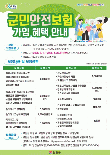 º°µµÀÇ °¡ÀÔÀýÂ÷¿Í ºñ¿ë ºÎ´ã ¾øÀÌ ÀÚµ¿À¸·Î º¸Çè¿¡ °¡ÀԵǸç, °³ÀÎÀÌ °¡ÀÔÇÑ º¸Çè°ú º°°³·Î Áߺ¹ º¸ÀåÀÌ °¡´ÉÇÏ´Ù. º¸Çè±Ý û±¸´Â »ç°íÀϷκÎÅÍ 3³â À̳»¿¡ ½Åû °¡´ÉÇϸç, ÇÕõ±º ¹Û¿¡¼ ¹ß»ýÇÑ »ç°í¶óµµ º¸ÀåÇ׸ñ¿¡ ÇØ´çÇÏ¸é º¸»ó±Ý û±¸°¡ °¡´ÉÇÏ´Ù.