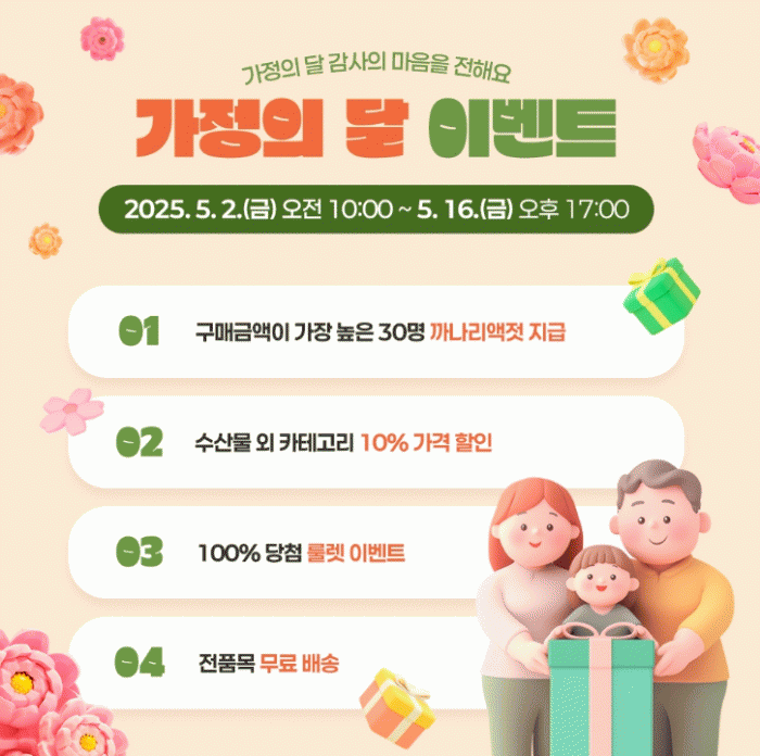¿À´Â 5¿ù 2ÀϺÎÅÍ 16ÀϱîÁö 2ÁÖ°£ ÁøÇàµÇ´Â¡®°¡Á¤ÀÇ ´Þ¸ÂÀÌ À̺¥Æ®¡¯¿¡¼´Â ¡ã±¸¸Å ±Ý¾× »óÀ§ 30¸í¿¡°Ô ±î³ª¸® ¾×Á£ ÁõÁ¤ ¡ã¼ö»ê¹° ¿Ü Àü Ä«Å×°í¸® 10% ÇÒÀÎ ¡ã¿ËÁøÀÚ¿¬¿¡¼ ÆÇ¸ÅÇÏ´Â ¸ðµç ǰ¸ñ ¹«·á¹è¼Û ¡ã100% ´ç÷ ·ê·¿ À̺¥Æ® ÄíÆù Á¦°ø µî dz¼ºÇÑ ÇýÅÃÀÌ ¸¶·ÃµÅ ÀÖ´Ù.