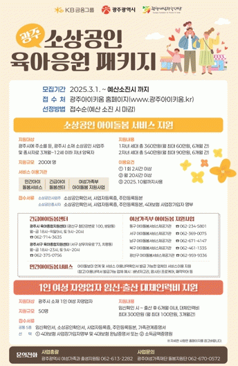 ±¤ÁÖ±¤¿ª½Ã´Â KB±ÝÀ¶±×·ìÀÇ ÈÄ¿ø(»ç¾÷ºñ 10¾ï¿ø)À¸·Î 3°³¿ù~12¼¼ Àڳฦ µÐ Áö¿ª ¼Ò»ó°øÀÎ(»ç¾÷ÁÖ ¹× Á¾»çÀÚ)¿¡°Ô ¾ÆÀ̵¹º½¼ºñ½º ÀÌ¿ë·á¸¦, 1ÀÎ ¿©¼º ÀÚ¿µ¾÷ÀÚ¿¡°Ô´Â ÀÓ½Å?Ãâ»ê ´ëüÀηºñ¸¦ Áö¿øÇÏ´Â ¡®±¤ÁÖ ¼Ò»ó°øÀÎ À°¾ÆÀÀ¿øÆÐŰÁö Áö¿ø»ç¾÷¡¯À» Áö³ÇØ 12¿ùºÎÅÍ ½ÃÇàÇϰí ÀÖ´Ù.