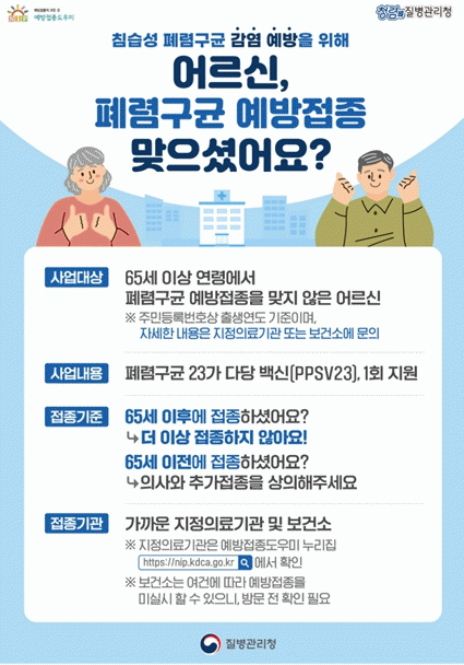 À̹ø Á¢Á¾Àº 23°¡ ´Ù´ç ¹é½Å(PPSV23)À¸·Î ÁøÇàµÇ¸ç, 1960³â 12¿ù 31ÀÏ ÀÌÀü Ãâ»ýÀÚ´Â °¡±î¿î ÁöÁ¤ÀÇ·á±â°üÀ̳ª º¸°Ç¼Ò¿¡¼ ¹«·á·Î Á¢Á¾(1ȸ) ¹ÞÀ» ¼ö ÀÖ´Ù.
