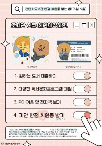 ¿À´Â 6¿ù°ú 9¿ù¿¡´Â õ¾È½Ã 9°³ µµ¼°ü ½Å±Ô ȸ¿øÀ» ´ë»óÀ¸·Î õ¾ÈÇÁ·»Áî ij¸¯ÅͰ¡ ±×·ÁÁø ±â°£ ÇÑÁ¤ ȸ¿øÁõÀ» ¹ß±ÞÇÒ ¿¹Á¤ÀÌ´Ù.