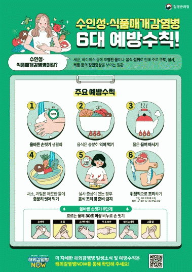 ¼öÀμº¡¤½Äǰ¸Å°³ °¨¿°º´À» ¿¹¹æÇϱâ À§Çؼ´Â ¡â¿Ã¹Ù¸¥ ¼Õ ¾Ä±â »ýÈ°È ¡âÀ½½ÄÀº ÃæºÐÈ÷ ÀÍÇô ¸Ô±â ¡â¹°Àº ²ú¿© ¸¶½Ã±â ¡âä¼Ò, °úÀÏÀº ±ú²ýÇÑ ¹°¿¡ ÃæºÐÈ÷ ¾Ä¾î ¸Ô±â ¡â¼³»ç Áõ»óÀÌ ÀÖ´Â °æ¿ì À½½Ä Á¶¸® ¹× Áغñ ±ÝÁö ¡âÀ§»ýÀûÀ¸·Î Á¶¸®Çϱ⠵î 6´ë ¿¹¹æ ¼öÄ¢À» ÁؼöÇØ¾ß ÇÑ´Ù.