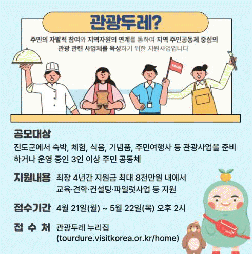 À̹ø ¸ðÁýÀº Áøµµ±º¿¡ °ÅÁÖÇÏ´Â 3ÀÎ ÀÌ»óÀÇ Áֹΰøµ¿Ã¼¸¦ ´ë»óÀ¸·Î Çϸç, ¼÷¹Ú, üÇè, ½ÄÀ½, ±â³äǰ, Áֹο©Çà»ç µî °ü±¤ °ü·Ã »ç¾÷À» Áغñ ÁßÀ̰ųª ÀÌ¹Ì ¿î¿µ ÁßÀÎ °øµ¿Ã¼°¡ Áö¿øÇÒ ¼ö ÀÖ°í, ¼±Á¤µÈ °øµ¿Ã¼¿¡´Â ÃÖ´ë 8õ¸¸ ¿øÀÇ »ç¾÷ºñ°¡ 4³â°£ Áö¿øµÈ´Ù.
