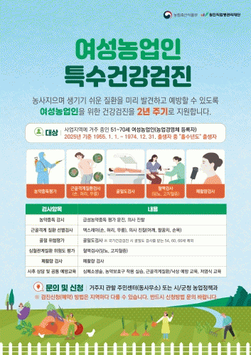 ¿©¼º³ó¾÷Àο¡ Æ¯ÈµÈ 5°³ Ç׸ñ(±Ù°ñ°Ý°è, ½ÉÇ÷°ü°è, °ñÀý¼Õ»óÀ§Çèµµ, ÆóȰ·®, ³ó¾àÁßµ¶)¿¡ ´ëÇÑ °ËÁø°ú ¿¹¹æ »ó´ã ¼ºñ½º¸¦ Áö¿øÇϰí ÀÖÀ¸¸ç, µµ Àüü Áö¿ø ÀοøÀº 3,870¸íÀ¸·Î °¢ ½Ã±º ³óÁ¤ºÎ¼¿Í À¾¸éµ¿ ÇàÁ¤º¹Áö¼¾ÅÍ¿¡¼ Àοø ¼ÒÁø ½Ã±îÁö ¼±Âø¼øÀ¸·Î ½ÅûÀ» ¹Þ°í ÀÖ´Ù.