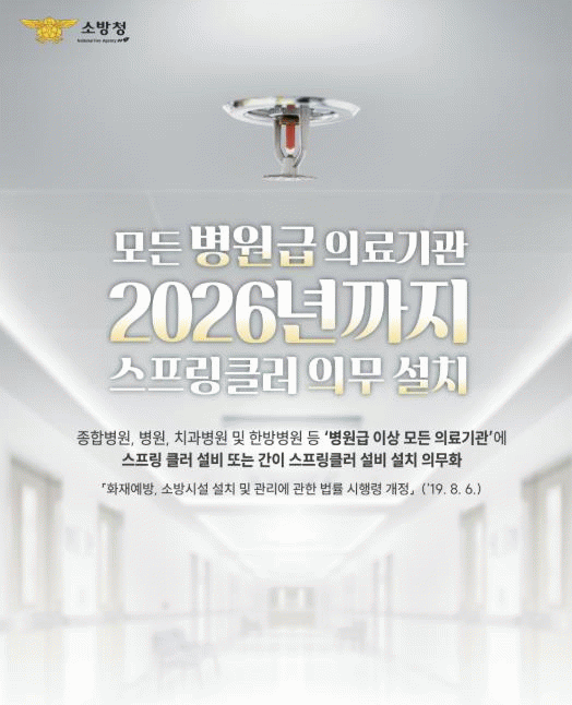°³Á¤µÈ'ÈÀ翹¹æ, ¼Ò¹æ½Ã¼³ ¼³Ä¡ ¹× °ü¸®¿¡ °üÇÑ ¹ý·ü ½ÃÇà·É(¡¯19.8.6.)'¿¡ µû¸£¸é Á¾ÇÕº´¿ø, º´¿ø, Ä¡°úº´¿ø, Çѹ溴¿ø µî º´¿ø±Þ ÀÌ»ó ÀÇ·á±â°üÀº ³»³â 12¿ù 31ÀϱîÁö ¿¬¸éÀû 600§³ ÀÌ»óÀº ½ºÇÁ¸µÅ¬·¯, 600§³ ¹Ì¸¸Àº °£À̽ºÇÁ¸µÅ¬·¯¸¦ Àǹ«ÀûÀ¸·Î ¼³Ä¡ÇØ¾ß ÇÑ´Ù.