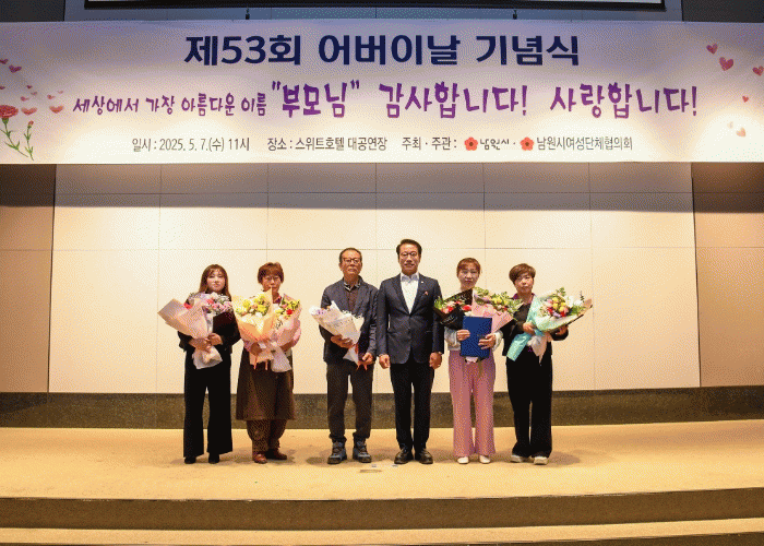 ¸ÕÀú, 5¿ù 7ÀÏ ³²¿ø½ºÀ§Æ®È£ÅÚ ´ë¿¬È¸Àå¿¡¼ ³²¿ø½Ã¿©¼º´ÜüÇùÀÇȸ ÁÖ°üÀ¸·Î ¿¸° ¡®Á¦53ȸ ¾î¹öÀ̳¯ ±â³äÇà»ç¡¯¿¡¼´Â Áö¿ª ¾î¸£½Å 100¿© ºÐÀ» ÃÊûÇÑ °¡¿îµ¥ ÃÖ°æ½Ä ½ÃÀå°ú °¢ ¿©¼º´ÜüȸÀåÀÌ Âü¼®ÇØ ÃàÇÏÀÇ ¸¶À½À» ÀüÇÏ¸ç µû¶æÇÑ ºÐÀ§±â ¼Ó¿¡¼ ÁøÇàµÆ´Ù.