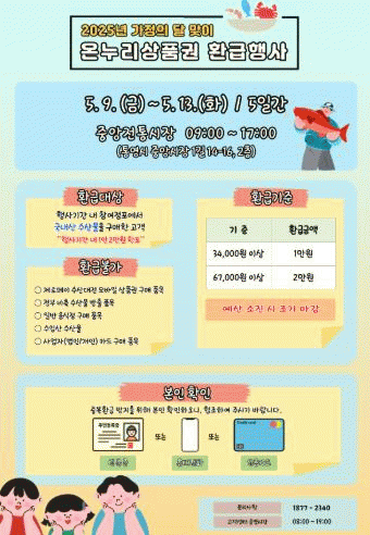 À̹ø Çà»ç´Â ¼ö»ê¹° ü°¨ ¹°°¡ÀÇ ¿ÏÈ¿Í ¼ÒºñÃËÁø, ÀüÅë½ÃÀå Ȱ¼ºÈ¸¦ ¸ñÀûÀ¸·Î ¸¶·ÃµÈ °ÍÀ¸·Î, ½ÃÀå ³» Çà»ç Âü¿© Á¡Æ÷¿¡¼ ±¹³»»ê ¼ö»ê¹°À» ±¸¸ÅÇÑ ¼ÒºñÀÚ°¡ ¿µ¼öÁõÀ» Çà»ç±â°£ ³» ȯ±Þ¼Ò¿¡ Á¦ÃâÇÏ¸é ±¸¸Å±Ý¾×¿¡ µû¶ó ÃÖ´ë 2¸¸¿ø±îÁö ¿Â´©¸®»óǰ±ÇÀ¸·Î ȯ±ÞÇØÁÖ´Â ¹æ½ÄÀ¸·Î ÁøÇàµÈ´Ù.