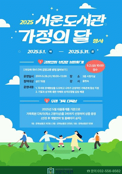 5¿ù ÇÑ ´Þ°£ ÁøÇàµÇ´Â À̹ø Çà»ç´Â ¡ã°¡Á· °£ÀÇ »ç¶ûÀ» µû¶æÇÏ°Ô ±×·Á³½ µµ¼ 40±ÇÀ» ¼±Á¤ÇÏ¿© Àü½ÃÇÑ ºÏÅ¥·¹ÀÌ¼Ç ¡®¿ì´çÅÁÅÁ ¿ì¸® °¡Á·¡¯, ¡ãÇÑ ´Þ°£ ¼¿îµµ¼°üÀÇ °¡Á·È¸¿ø ´Ùµ¶ÀÚ 3°¡Á·À» ¼±Á¤ÇÏ¿© »óǰÀ» ÁõÁ¤ÇÏ´Â ¡®¿ì¸® °¡Á· ´Ùµ¶»ó¡¯ µîÀ¸·Î ¿î¿µµÈ´Ù.