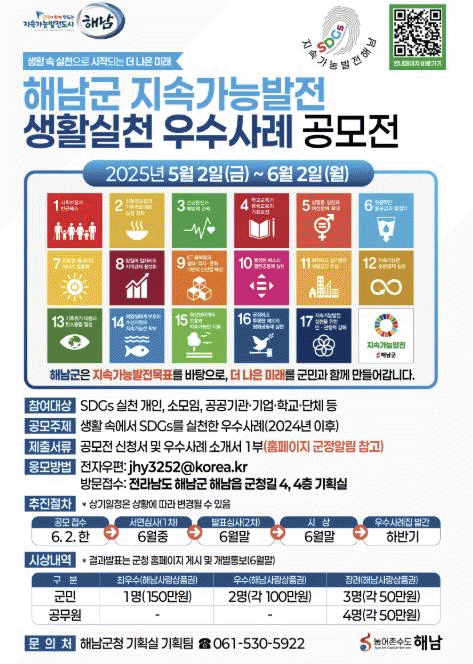 °ø¸ðÀüÀº¡®»ýȰ ¼Ó ½ÇõÀ¸·Î ½ÃÀ۵Ǵ ´õ ³ªÀº ¹Ì·¡¡¯¸¦ ÁÖÁ¦·Î ¡ã±º¹ÎÀÇ ÀÏ»ó»ýȰ ¼Ó ÀÚ¹ßÀû ½Çõ »ç·Ê ¡ã±â°ü¡¤´Üü¡¤±â¾÷ µîÀÌ ÃßÁøÇÑ Áö¼Ó°¡´É¹ßÀü Çù·Â »ç¾÷ »ç·Ê µî ÇØ³²±ºÀÇ Áö¼Ó°¡´É¹ßÀü¸ñÇ¥ 17°³ Ç׸ñ Áß 1°³ ÀÌ»ó°ú ¿¬°èµÈ ³»¿ëÀÌ¸é µÈ´Ù.