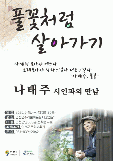 ¡®Ç®²Éó·³ »ì¾Æ°¡±â - ³ªÅÂÁÖ ½ÃÀΰúÀÇ ¸¸³²¡¯ÀÌ ¿À´Â 5¿ù 15ÀÏ ¿ÀÈÄ 1½Ã 30ºÐ ¿¬Ãµ¼ö·¹¿ï¾ÆÆ®È¦ ´ë°ø¿¬Àå¿¡¼ °³ÃֵȴÙ. À̹ø °¿¬Àº ¡®Ç®²Éó·³ »ì¾Æ°¡±â¡¯¸¦ ÁÖÁ¦·Î, ½ÃÀÎÀÌ Á÷Á¢ µé·ÁÁÖ´Â »î°ú ½ÃÀÇ ÅëÂûÀ» ÅëÇØ ±º¹Îµé¿¡°Ô À§·Î¿Í ¼ºÂûÀÇ ½Ã°£À» Á¦°øÇÒ ¿¹Á¤ÀÌ´Ù.