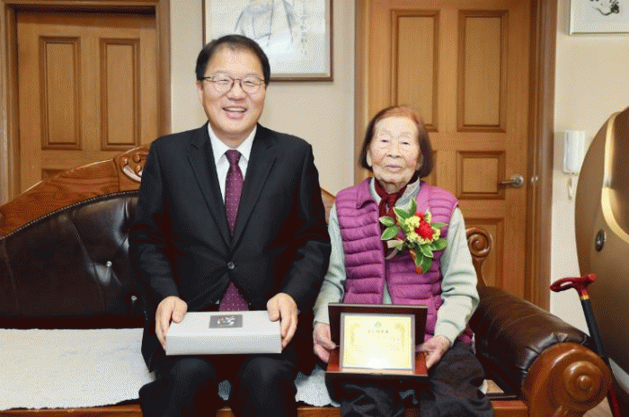 ÇÑÆí â¿ø½Ã´Â 100¼¼ ¾î¸£½Å¿¡°Ô´Â Àå¼ö±â³äÆÐ¿Í ÃàÇϹ°Ç°À» Áö¿øÇϰí 100¼¼ ÀÌ»ó ¾î¸£½ÅÀÇ »ýÀÏ ¶§¸¶´Ù ÃàÇÏ ¹°Ç°À» Àü´ÞÇÑ´Ù. ÇöÀç 100¼¼ ÀÌ»ó Àå¼ö ¾î¸£½ÅÀº 95¸íÀ̸ç, ÃÖ°í·ÉÀÚ´Â ¹Ý¼Ûµ¿¿¡ °ÅÁÖÇÏ´Â ±è00 ¾î¸£½ÅÀÌ´Ù.