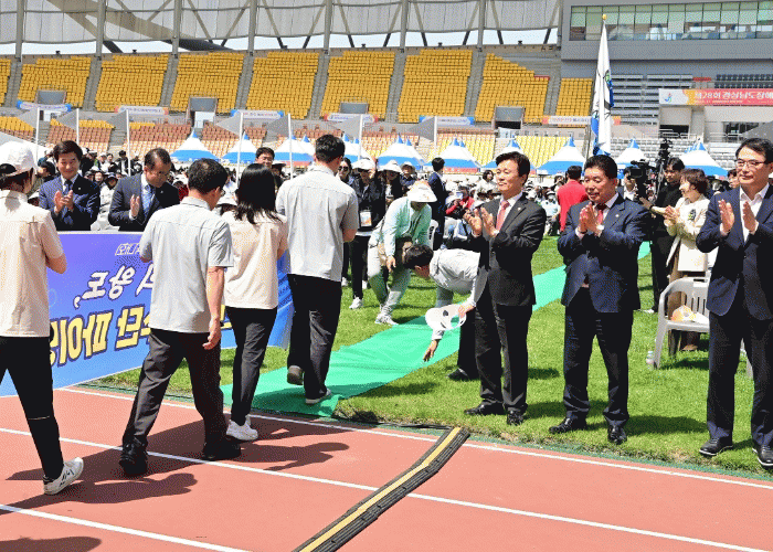 °³È¸½Ä¿¡ ÀÌ¾î ´ëȸ±â°£ Áß Á¶±ÔÀÏ ÁøÁÖ½ÃÀåÀº Á¾¸ñº° °æ±â°¡ Ä¡·¯Áö´Â ÁøÁÖÁ¾ÇÕ°æ±âÀå ¹× ¸ð´öüÀ°°ø¿ø µî¿¡ Á÷Á¢ ã¾Æ °æ±âÀå °÷°÷À» µÑ·¯º¸¸ç Âü°¡ ¼±¼ö´ÜÀ» °Ý·ÁÇÏ°í ¼±ÀüÀ» ±â¿øÇßÀ¸¸ç, ÀÚ¿øºÀ»çÀÚ ¹× ´ëȸ°ü°èÀÚµéÀÇ ³ë°í¿¡ °¨»çÀÇ ¸¶À½À» ÀüÇß´Ù.