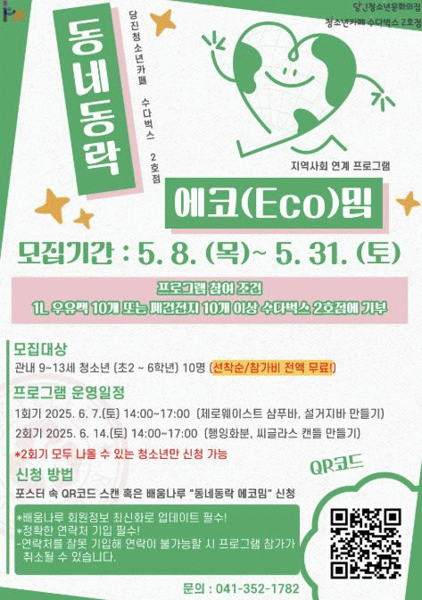 ´çÁøÃ»¼Ò³âÄ«Æä ¼ö´Ù¹÷½º 2È£Á¡¿¡¼ Á¦°øµÇ´Â ¡®µ¿³×µ¿¶ô ¿¡ÄÚ¹Ò¡¯ ÇÁ·Î±×·¥Àº ÇöÀç¿Í ¹Ì·¡¼¼´ëÀÇ ÁÖ¿ªÀΠû¼Ò³âµéÀÌ È¯°æ¿À¿°ÀÇ ½É°¢¼ºÀ» ÀÎÁöÇÑ ÈÄ ±â°ü ¹× °¡Á¤¿¡¼ ¹ß»ýÇÑ ¿ìÀ¯ÆÑ, Æó°ÇÀüÁö µî ÀçȰ¿ëµÇ´Â ¹°Ç°µéÀ» ¸ð¾Æ ±â°ü¿¡ °¡Á®¿Í Á¦·Î¿þÀ̽ºÆ® ¼¤Çª¹Ù ¹× ¼³°ÅÁö¹Ù, ÆäÆ®º´À» ÀçÈ»¿ëÇÑ ÇàÀ× ÈºÐ, ¾¾±Û¶ó½º ĵµéÀ» ¸¸µå´Â ¾÷»çÀÌŬ¸µ °ø¿¹È°µ¿¿¡ Âü¿©ÇØ ³ª¸¸ÀÇ ÀÛǰÀ» ¸¸µé¸ç ¼ºÃë°¨ ¹× ÀÚ¿ø¼øÈ¯ÀÇ Àǹ̸¦ °æÇèÇÒ ¼ö ÀÖµµ·Ï ÇÏ´Â ÇÁ·Î±×·¥ÀÌ´Ù.