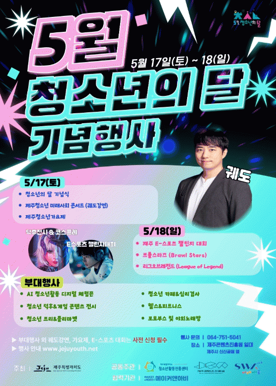 [HKSÇàÁ¤¹æ¼Û]Á¦ÁÖÆ¯º°ÀÚÄ¡µµÃ»¼Ò³âȰµ¿ÁøÈï¼¾ÅÍ(¼¾ÅÍÀå °­¿Á·Ã)´Â 5¿ù û¼Ò³âÀÇ ´ÞÀ» ¸Â¾Æ û¼Ò³âµéÀÇ ²Þ°ú ¿­Á¤À» ÀÀ¿øÇÏ´Â '2025 û¼Ò³âÀÇ ´Þ ±â³äÇà»ç'¸¦ 5¿ù 17ÀϺÎÅÍ 18ÀϱîÁö ¾çÀϰ£ Á¦ÁÖÄÜÅÙÃ÷ÁøÈï¿ø ÀÏ´ë¿¡¼­ °³ÃÖÇÑ´Ù.