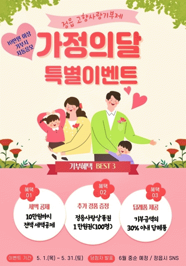 À̹ø À̺¥Æ®´Â °íÇâ»ç¶û±âºÎÁ¦ Ȱ¼ºÈ¸¦ µµ¸ðÇϰí, °¡Á¤ÀÇ ´ÞÀ» ¸Â¾Æ °íÇâ¿¡ ¹æ¹®Çϰųª ¸¶À½À» ÀüÇÏ´Â ±âºÎÀڵ鿡°Ô ´õ ¸¹Àº ÇýÅÃÀ» Á¦°øÇϱâ À§ÇØ ÁغñµÆ´Ù. Á¤À¾ ¿Ü Áö¿ª¿¡ Áֹεî·ÏÀÌ µÇ¾î ÀÖ´Â »ç¶÷ÀÌ ÀÌ ±â°£ µ¿¾È Á¤À¾½Ã¿¡ 10¸¸¿ø ÀÌ»ó ±âºÎÇÏ¸é º°µµÀÇ ½Åû ¾øÀÌ ÀÚµ¿À¸·Î ÀÀ¸ðµÈ´Ù.