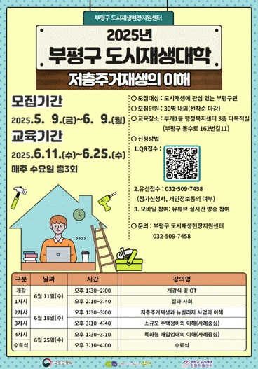 ¸ðÁý ÀοøÀº 30¸í(¼±Âø¼ø)ÀÌ´Ù. ºÎÆò±¸¹ÎÀ̶ó¸é ´©±¸³ª Âü¿© °¡´ÉÇϸç, Âü¿©¸¦ ¿øÇÒ °æ¿ì ¿À´Â 6¿ù 9ÀϱîÁö ºÎÆò±¸ µµ½ÃÀç»ýÇöÀåÁö¿ø¼¾ÅÍ ºí·Î±×¸¦ Âü°íÇØ ÀüÈ ¶Ç´Â Å¥¾Ë(QR)ÄÚµå·Î ½ÅûÇÒ ¼ö ÀÖ´Ù.