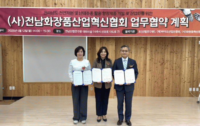 ¿Àµæ½Ç Àü³²»ê¸²¿¬±¸¿øÀåÀº ¡°À̹ø Çù¾àÀº Àü³² »ê¸²ÀÚ¿øÀ» Ȱ¿ëÇÑ ÇâÀå¼ÒÀçÀÇ ±â´É¼º °ËÁõ°ú »ê¾÷Àû Ȱ¿ë °¡´É¼ºÀ» ³ÐÈ÷´Â ÀüȯÁ¡ÀÌ µÉ °Í¡±À̶ó¸ç ¡°±â´É¼º ÇâÀåÁ¦Ç° °³¹ß°ú »ê¸²¹ÙÀÌ¿À¼ÒÀçÀÇ °íºÎ°¡°¡Ä¡È¸¦ ÅëÇØ ±¹¹Î °Ç°°ú Áö¿ª»ê¾÷ ¹ßÀü¿¡ ±â¿©Çϰڴ١±°í ¹àÇû´Ù.